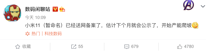 最后是小米11系列的消息,据爆料达人透露:小米11已经送往备案,预计下个月正式公示,开始产能爬坡。