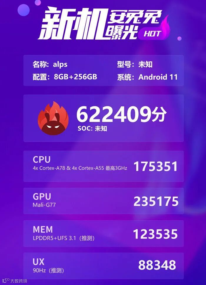 安兔兔报道称,联发科这颗全新SoC的CPU采用四核心Cortex-A78➕四核心Cortex-A55设计,GPU为Mali-G77,测试机配备8+256GB存储空间,屏幕分辨率为2300×1080,刷新率据推测应该是90Hz。
