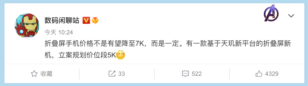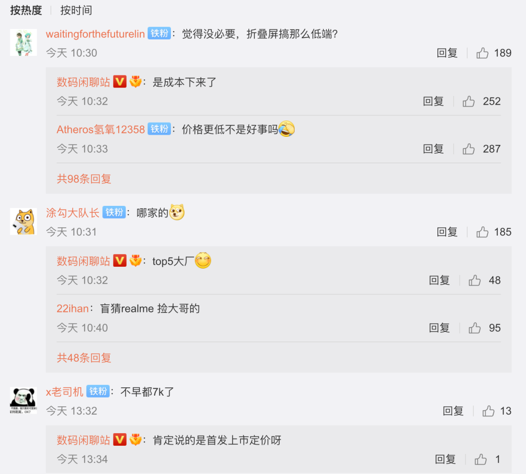 不过具体处理器平台,乃至更多配置方面其暂未透露。从其微博互动来看,这款搭载天玑处理器的折叠屏新机是TOP 5厂商的(不靠谱瞎分析下,可能是Redmi?🤔),进一步信息就慢慢等待后续消息吧。