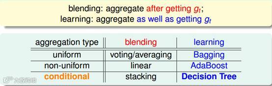 最后我们也可以按照林轩田老师课程中的讲述来对机器学习集成算法做一个归纳。集成模型主要分为两条主线,一条Blending 线,一条 Learning线。Blending 假设我们已经得到了各个基础分类器 ,learning 主要指我们面对的是一堆数据,需要一边获得基础分类器 ,同时一边学习融合它们的方法。