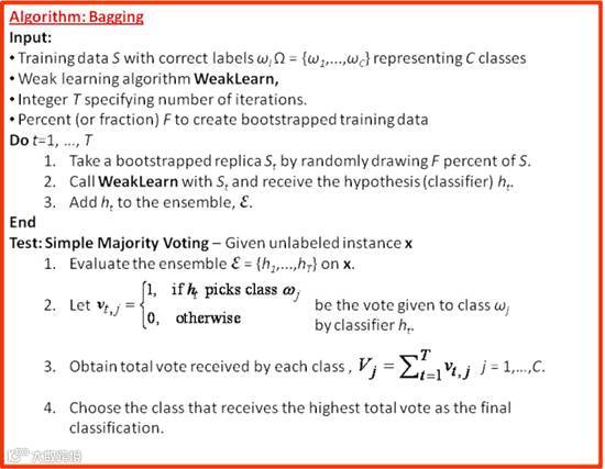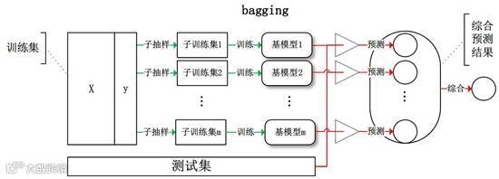 Bagging:基于数据随机重抽样的分类器构建方法。从训练集从进行子抽样组成每个基模型所需要的子训练集,对所有基模型预测的结果进行综合产生最终的预测结果 :