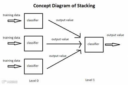 在堆叠中,组合机制是分类器(0级分类器)的输出将被用作另一个分类器(1级分类器)的训练数据,以近似相同的目标函数。基本上,让1级分类器找出合并机制。