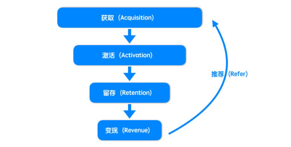 AARRR:增长黑客的海盗法则,精益创业的重要框架,从获取(Acquisition)、激活(Activition)、留存(Retention)、变现(Revenue)和推荐(Referral)5个环节增长增长。