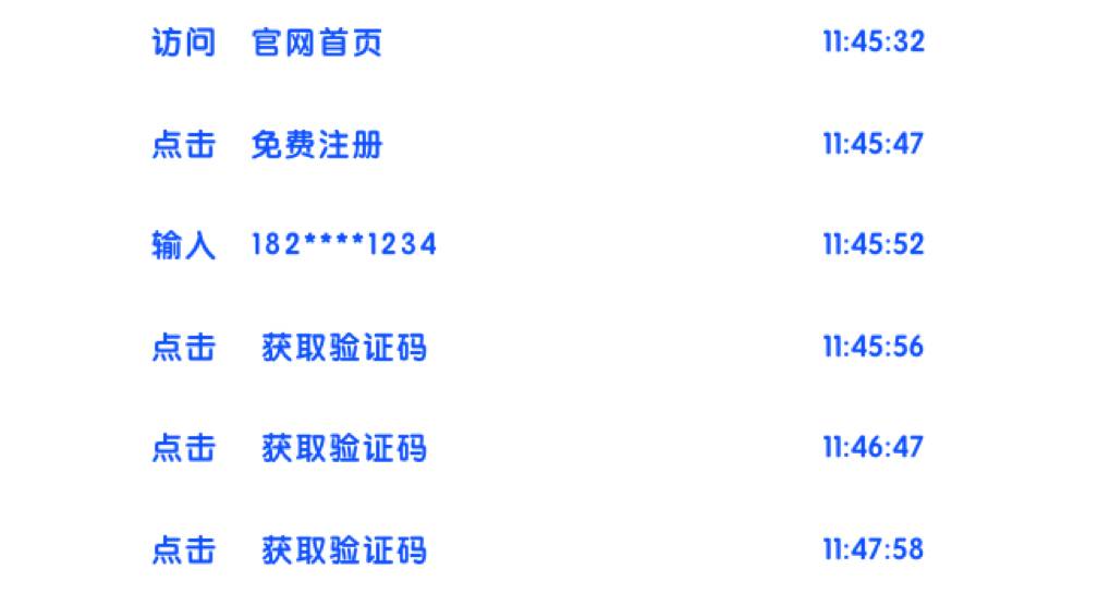 用户经历了如下的操作流程:【访问官网】-【点击注册】-【输入号码】-【获取验证码】。本来是非常流畅的一个环节,但是却发现一个用户连续点击了3次【获取验证码】然后放弃提交。这就奇怪了,用户为什么会多次点击验证码呢?