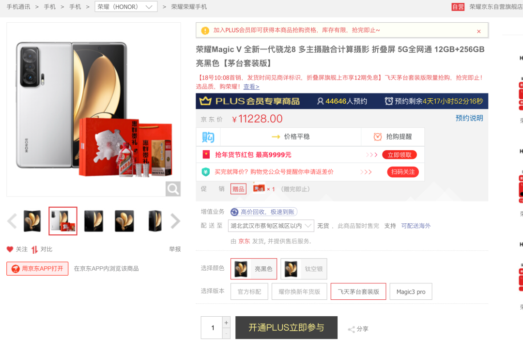 前几天荣耀发布了首款折叠屏Magic V旗舰,其12+256GB版售价9999元,12+512GB版售价10999元,目前已经开启预售,将于1月18日10:08正式开售。今天注意到京东自营旗舰店还上架了一个茅台套装版。