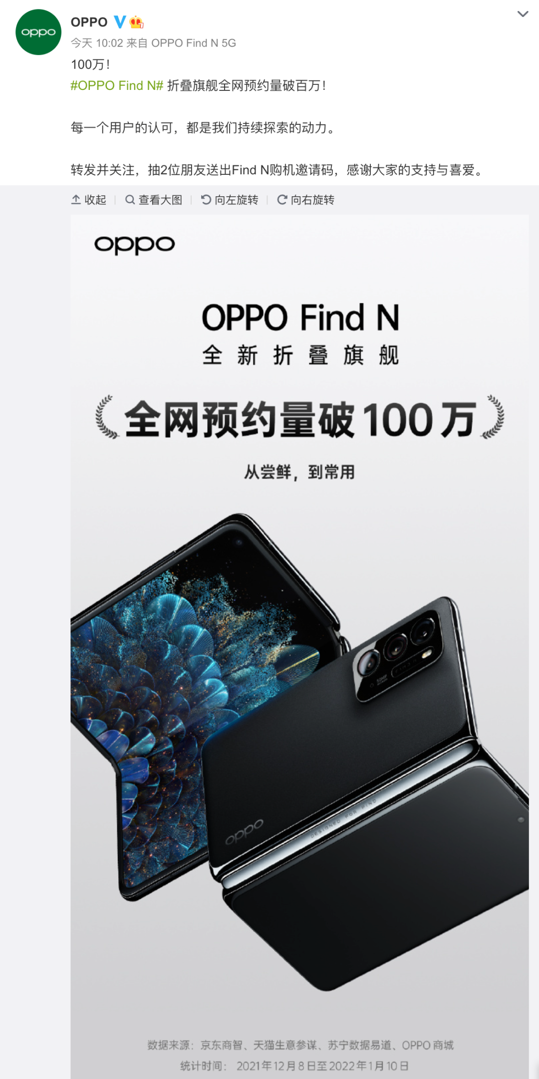 另一边,同样是折叠屏旗舰,OPPO Find N今天早上官方公布了预约量:全网预约量破百万台,刘作虎还表示“这是我在发布会以来第二个最激动的时候”。不知道实际销量如何~