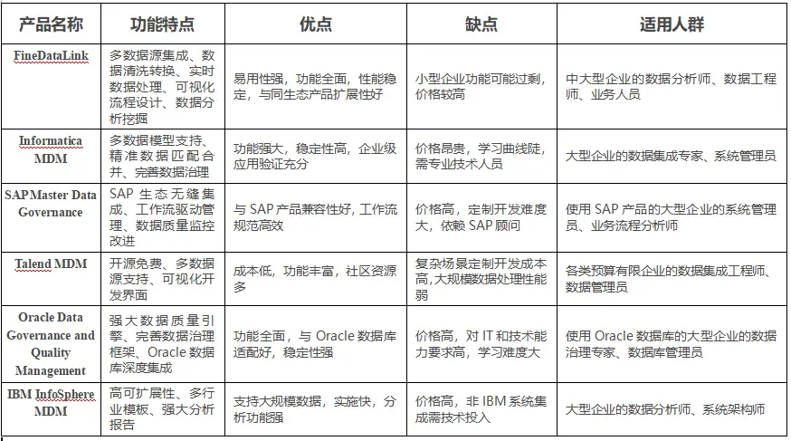 而Informatica MDM、Oracle Data Governance and Quality Management这些工具,功能复杂,操作难度大,必须得有专业的技术人员,比如数据集成工程师、数据库管理员,他们懂技术,能搞定配置和维护,普通业务人员根本操作不了。你懂我意思吗?就是不能只看能不能上手,还得看企业有没有对应的技术人员,不然就算买了工具也用不好。