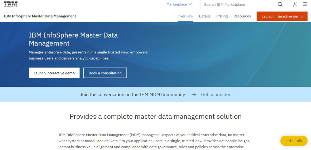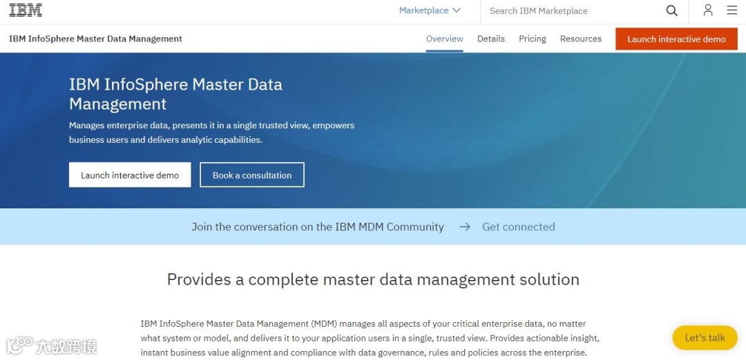 IBM InfoSphere MDM是IBM推出的主数据管理解决方案,功能强,应用范围也广。它主要帮企业解决大规模主数据的管理问题,能实现主数据的集中管理和共享,让企业运营效率更高,做决策的时候也能有更准的数据支撑。