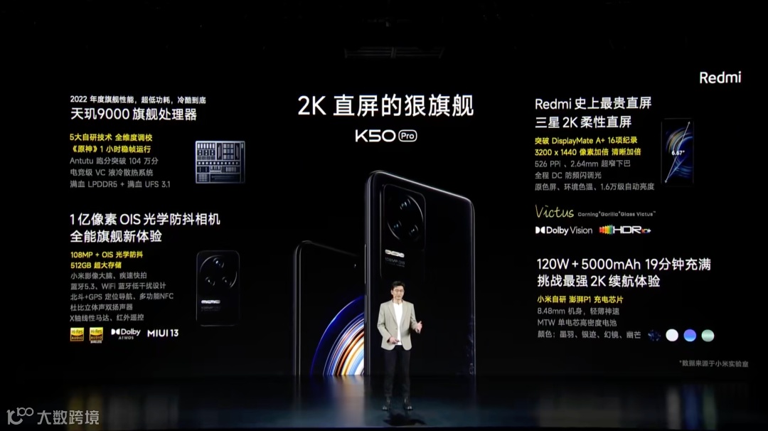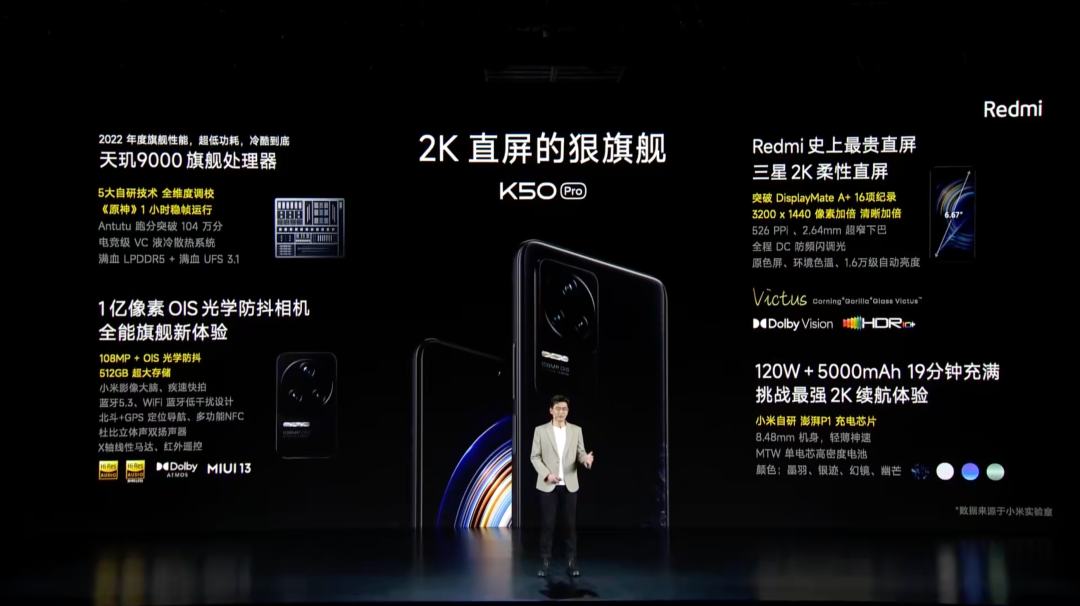 价格上, Redmi K50 Pro(天玑9000➕108MP➕120W快充) 8+128GB售价2999元,8+256GB售价3299元,12+256GB版售价3599元,12+512GB版售价3999元,今晚21点开启预售,3月22日上午10点全渠道首卖;