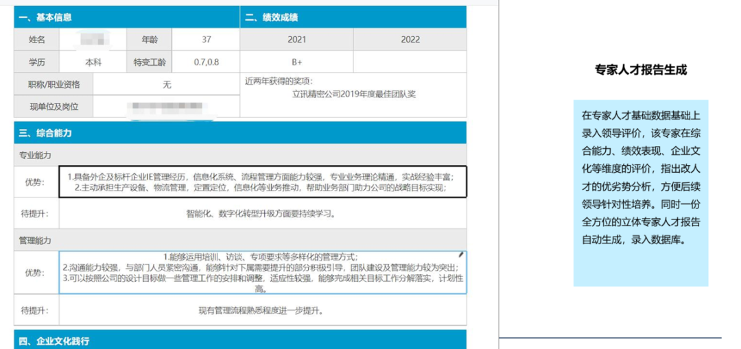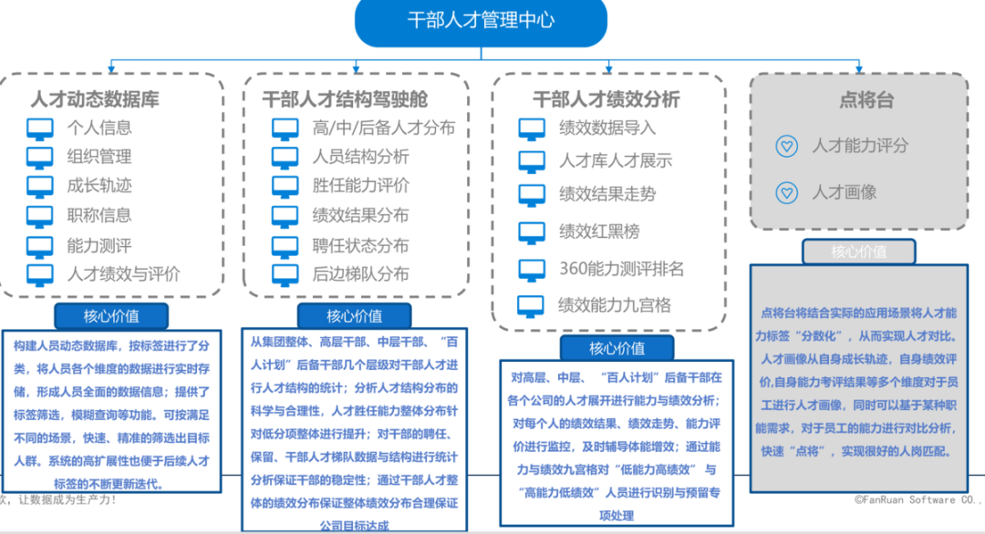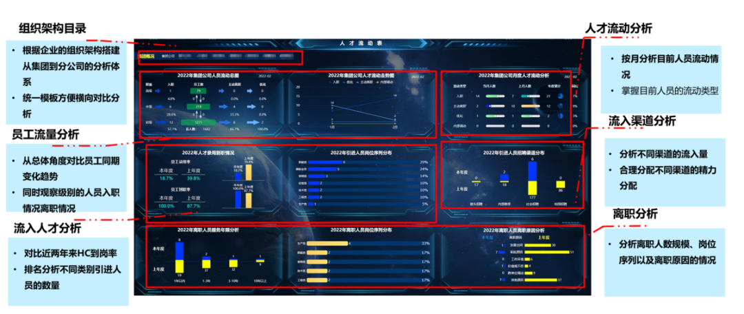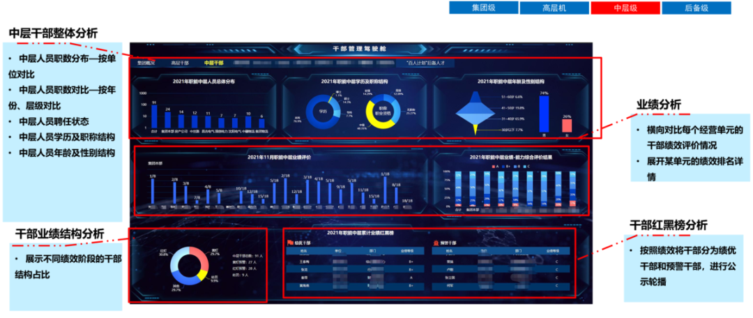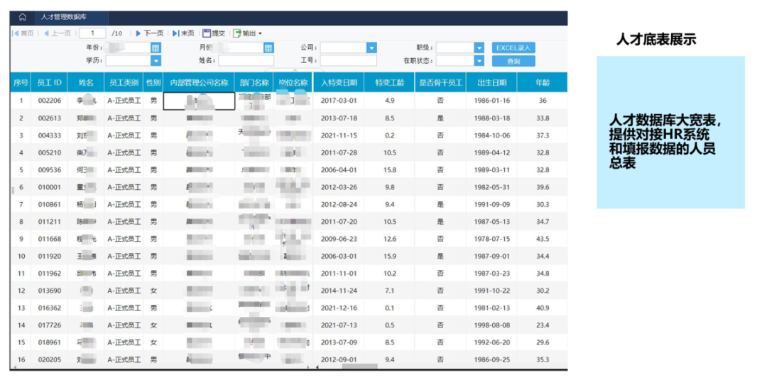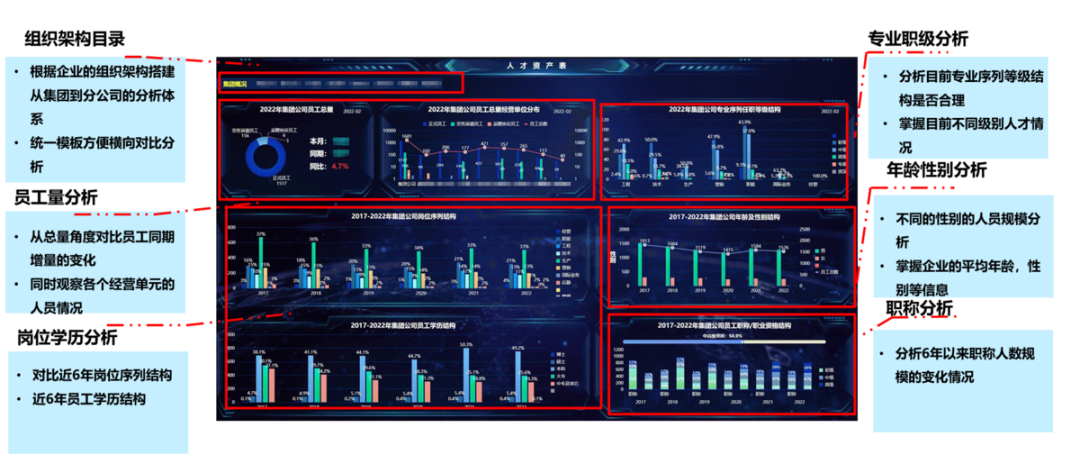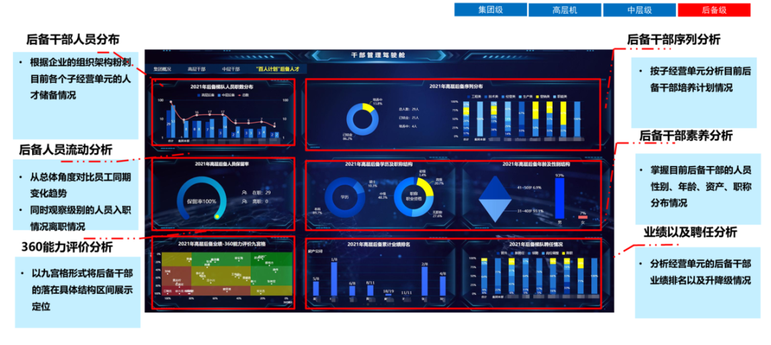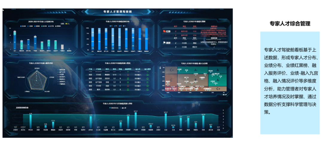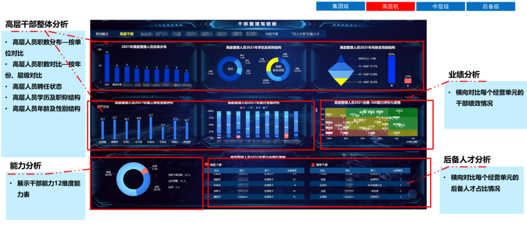 对于人才管理平台的全部内容我都详细的用图片的形式表明,大家可以参考一下图片里的驾驶舱和表格,这类可视化图表对于人才的管理是非常高效的,尤其是后期的数据管理和数据分析方面。完全不需要像使用Excel一样有上千个表格,你要自己分类,找数据的时候也要一个一个找,改数据的时候也是一直在做重复的工作。所以这里高效的意思就是高产出,高效率地做人才管理。
