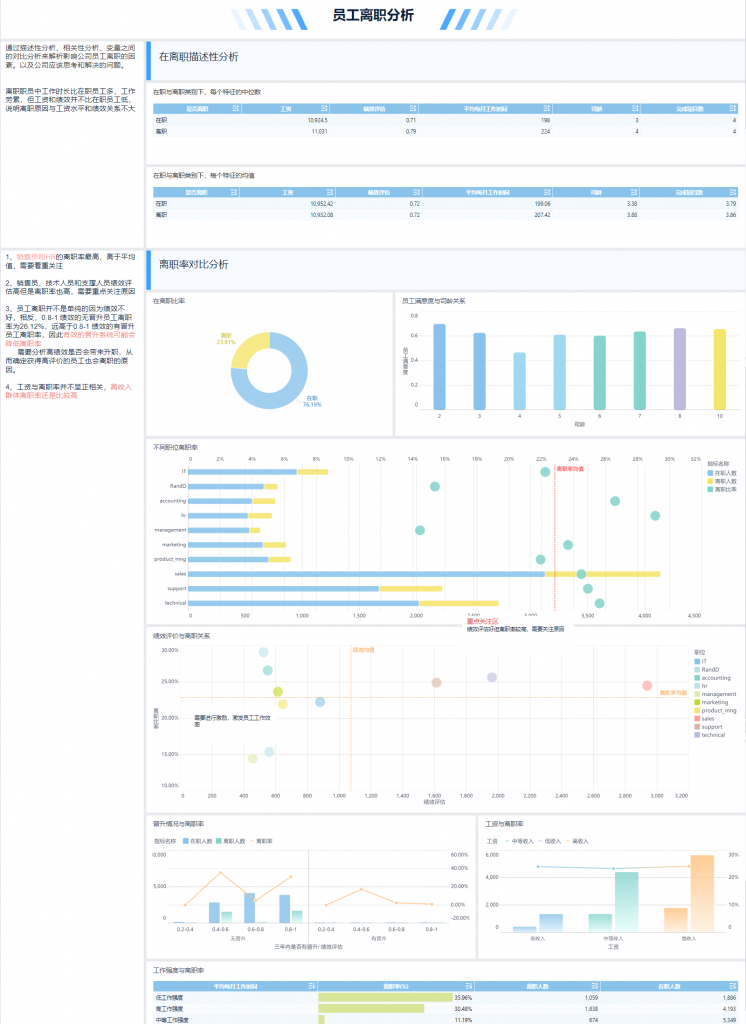通过上述这样的场景洞悉、维度分析、计划制定和数据准备、加工的流程,我们就可以灵活、方便地借助BI智能分析工具对人事数据进行分析了。下图便是试用FineBI制作的员工离职分析看板,无论是统计离职率、入职率还是分析其他与员工流动相关的指标,利用好BI工具都让分析会变得更加简单和直观,最终得到高质量、高价值的数据分析结果,制定相应的应对策略。