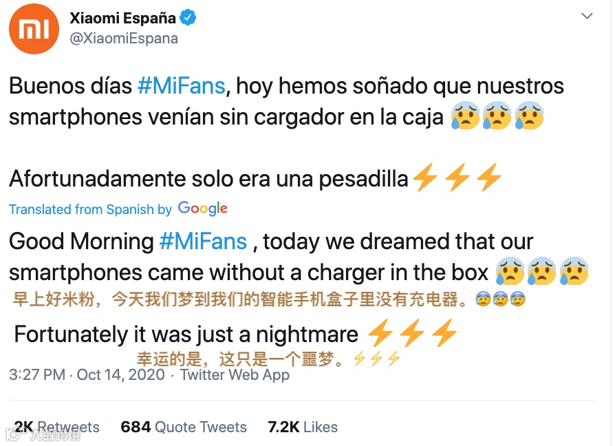 小米海外官方账号也暗戳戳Diss苹果包装盒不附带充电器。
