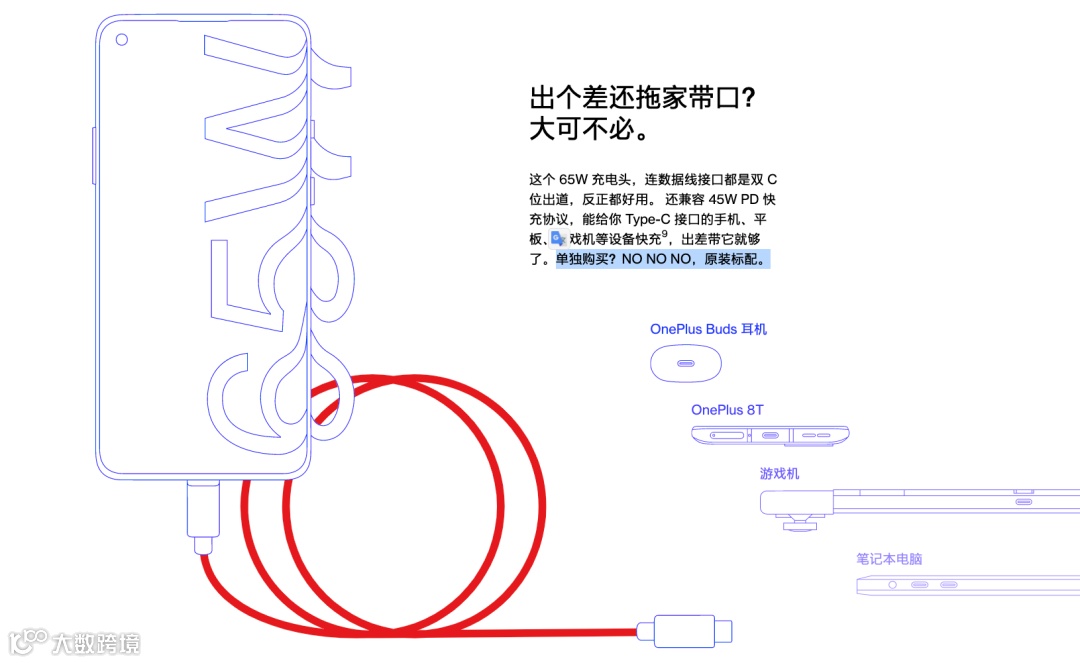 一加8T国行官网的商品详情页关于充电部分「65W充电头...单独购买?No No No 原装标配。」