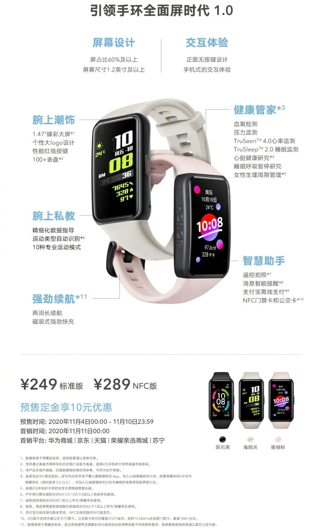 外观上,荣耀手环6采用一块1.47英寸彩屏,全面屏设计,正面没有按键,在侧边有一颗红线处理的按键,左侧的大logo设计略感违和...提供100+表盘,陨石黑、海鸥灰、珊瑚粉3个配色。