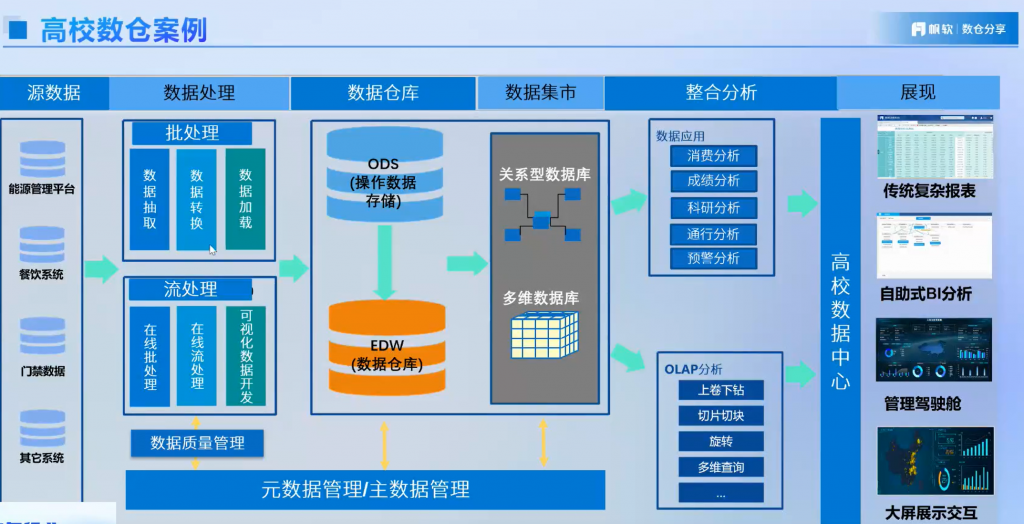 总的来说,基于ETL工具搭建数据仓库,可以实现数据标准化,使得数据质量得到保证,为后续的数据分析和报告提供了可靠的基础;管理可视化,让高校管理层能够实时监控校园的运营状况,及时发现并解决问题,提高管理效率;数据共享的高效化,为高校内部的协作和知识共享提供了便利,促进了资源的优化配置和利用。