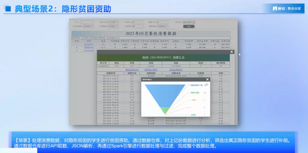 另一个值得关注的场景是隐形贫困资助。在高校中,有些学生家庭贫困但出于各种原因不愿申请补助或贷款。为了精准识别这些隐形贫困学生,可以利用数据仓库对上亿份消费数据进行深度分析。通过API取数解析和Spark大数据引擎的数据处理与过滤功能,得出每个学生的贫困可能性比率与等级,并结合宿舍通行数据、贫困建档等级等信息完成了资助分析。高校可根据分析结果直接将补助打入学生校园卡,实现精准资助。
