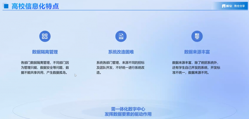 在数字化时代,信息化管理水平直接影响着高校的教育质量和学术研究效率。而高校信息化管理离不开数据仓库的建设,因为它是实现校园信息化建设和智能化管理的基石。数据仓库能够整合学生档案、健康、出入校等各个系统的数据资源,实现数据的集中管理和分析。通过数据仓库,学校能够优化资源配置,提高运营效率,推动个性化教育和科研创新。同时,数据仓库还有助于校园管理可视化,及时发现问题,形成预警,提供更加精准和个性化的服务,实现校园环境的智能化管理,打造智慧校园,为师生创造一个高效、安全、便捷的学习和工作环境。