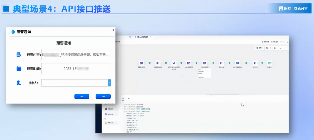在数据仓库的深入构建过程中,API接口的推送功能确实构成了一个非常典型的应用场景。具体而言,这一功能主要面向我们之前所提及的大量风控模型及其产生的预警数据。针对不同种类的预警内容,我们需要确保这些信息能够准确无误地推送至相关人员的微信上。
