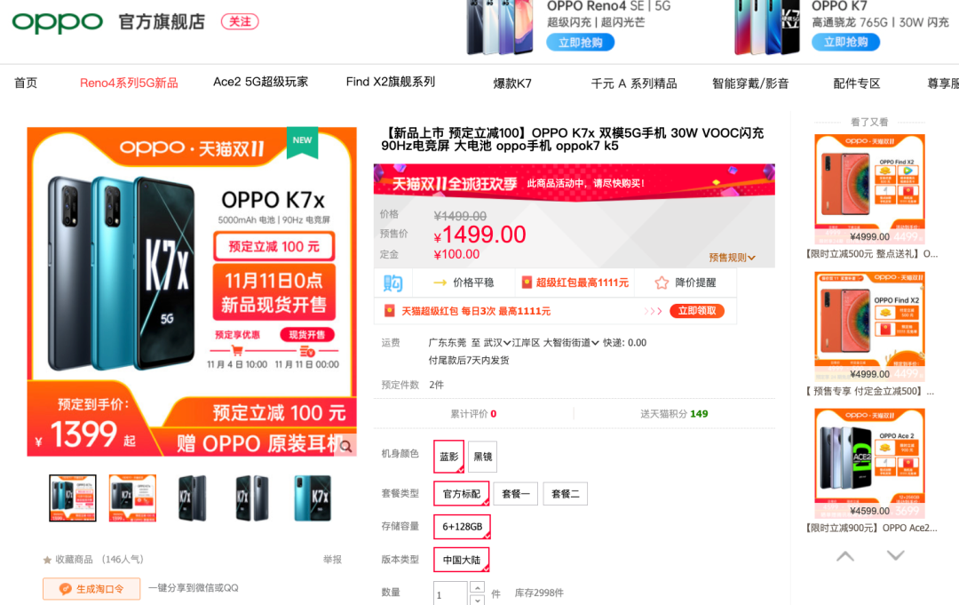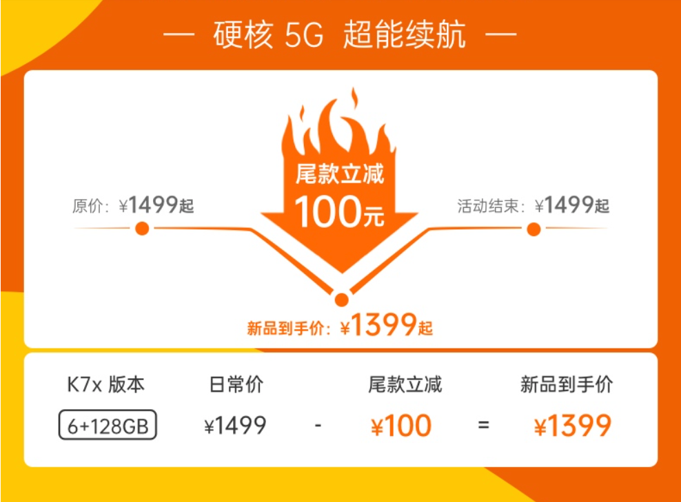 价格上,OPPO K7x 6+128GB售价1499元,首发价1399元,将于11月11日0点正式开售。