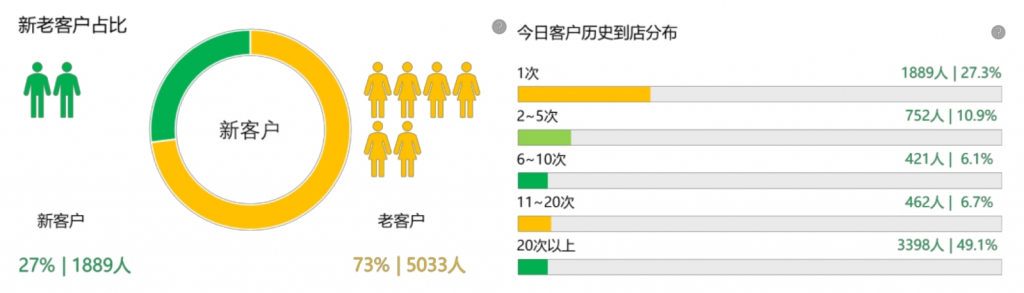 面对客流量的异常,需要从多个角度进行分析。例如,若客流量正常,其分布情况是否合理?为了深入理解这些问题,该连锁超市的BI系统提供了定制化的分析页面,特别关注两个关键指标:新老客户的占比以及今日客户与历史到店的分布情况。