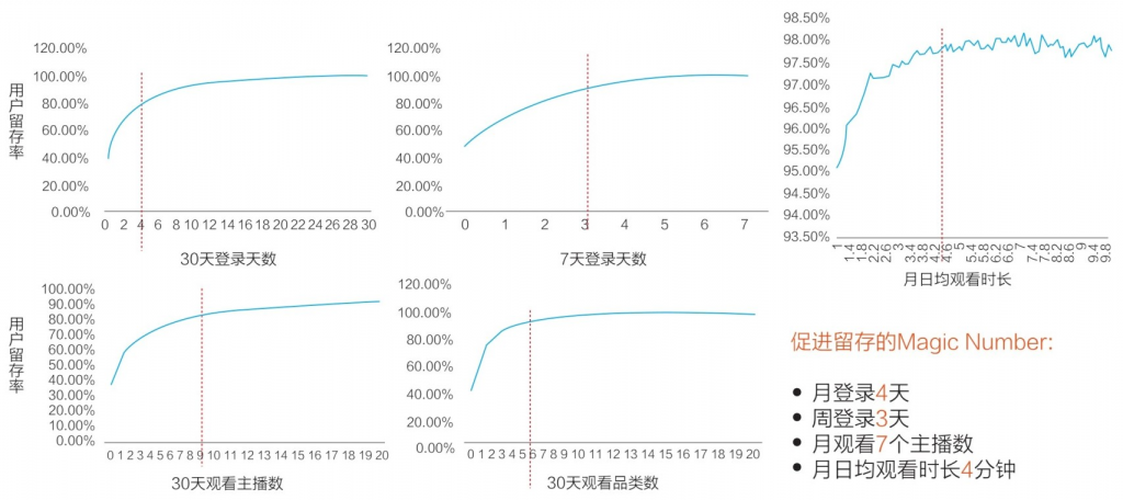 月观看7位主播:用户如果一个月内观看了7位不同的主播,留存率会有大幅增加。