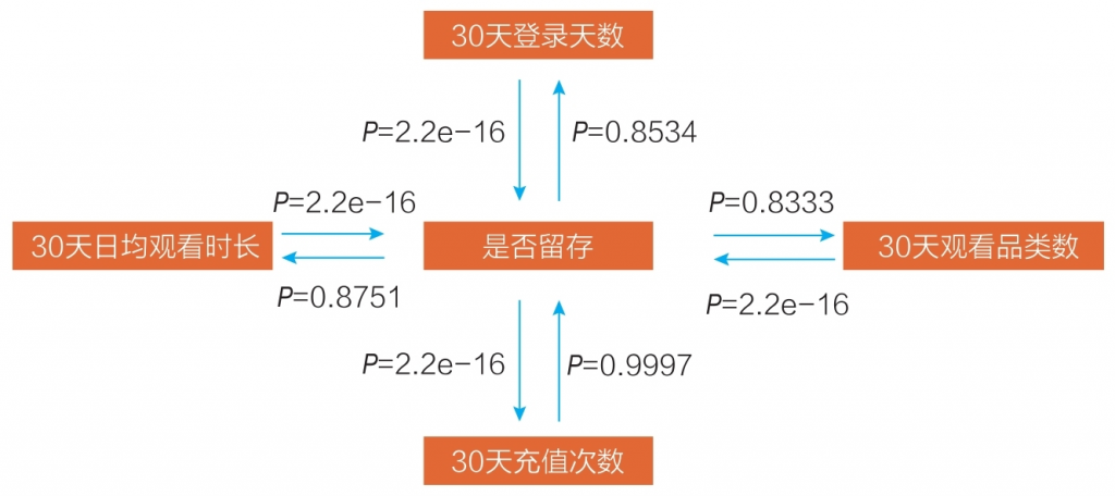 假设检验与决策:我们对行为因素X与用户留存率Y之间的潜在因果关系进行格兰杰因果检验。如果检验得到的P值超过0.05,我们将接受原假设,即认为X与Y之间不存在因果关系;如果P值小于0.05,我们将拒绝原假设,认为存在一定的因果关系。