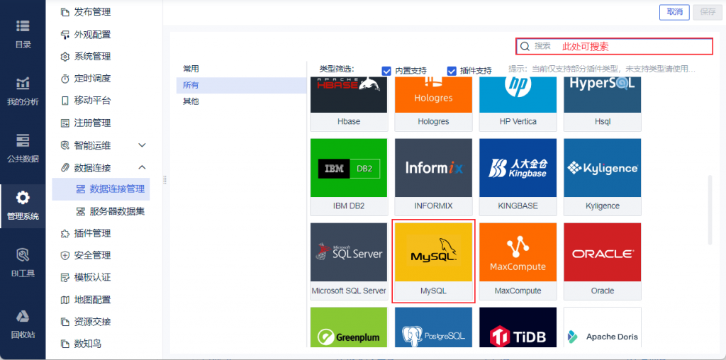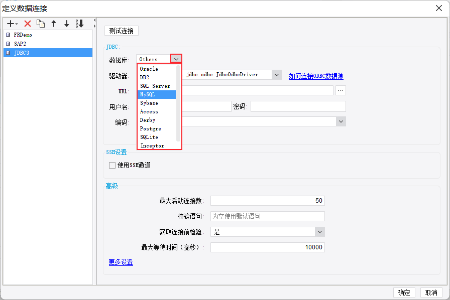 FineReport 支持通过 JDBC、JNDI、SAP、XMLA 和 FineBI 五种方式连接数据库。大部分数据库使用的的是 JDBC 连接,在设计器中我们可以连接帆软官方支持的所有数据库。如下图所示: