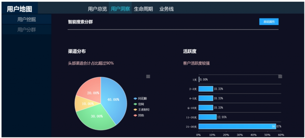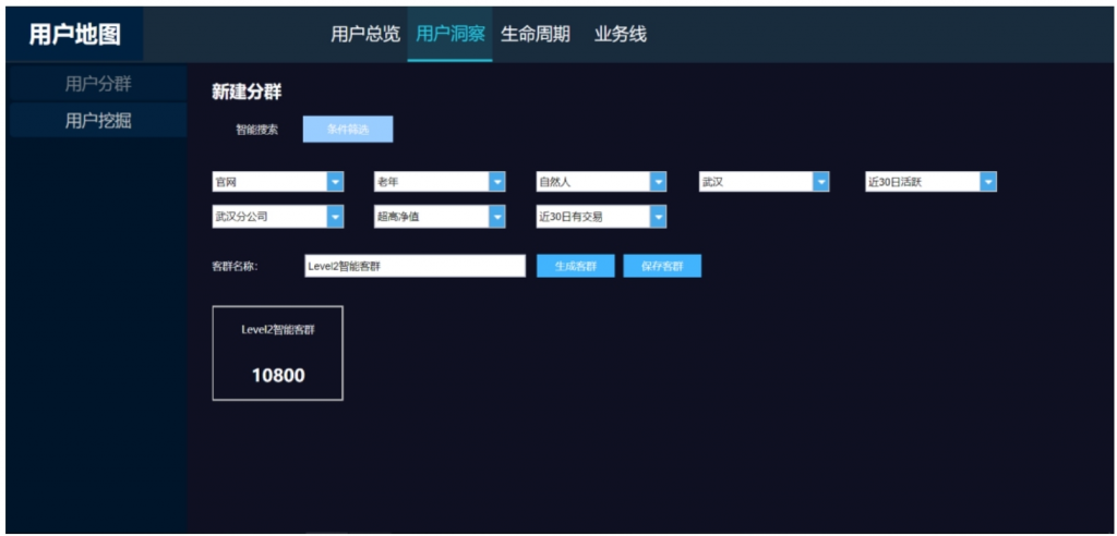 该模块是用户地图的核心,集成了用户分群、用户洞察和用户画像等功能。管理员可以依据系统中记录的用户年龄、性别、资产规模、交易行为和产品购买历史等信息,对用户群体进行多维度细分,并利用用户洞察模块深入分析各细分群体的特征。