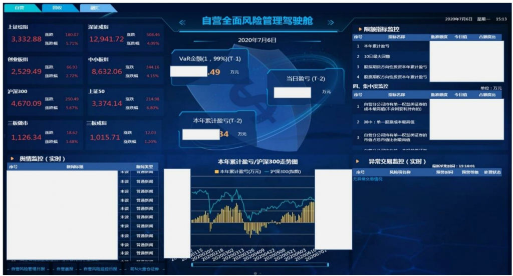 驾驶舱为公司决策者和业务线风险管理负责人提供了一个直观的可视化界面,展示关键风险指标,如盈亏情况、VaR(风险价值)、负面舆论、限额和预警等,以支持全面风险管理。