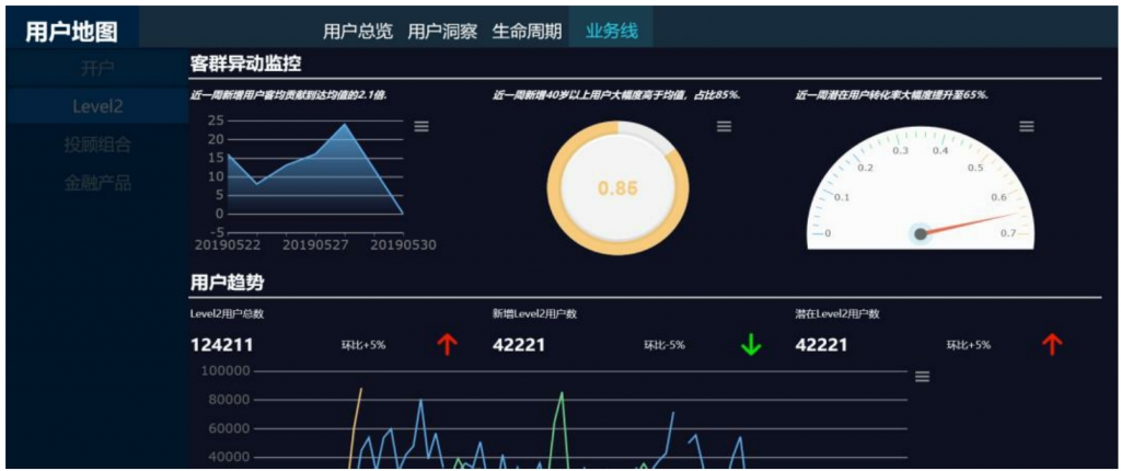 该模块根据公司内部业务线的划分,展示各业务线的具体表现,如理财产品销售量、投资咨询服务销量、新开户情况等。通过这一模块,各业务线负责人能够实时了解业务进展,及时做出调整,以提高业务响应速度和市场竞争力。