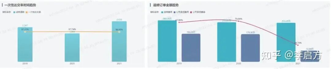 查看一次性达交率和道数趋势,发现2021年比2020年订单品质略微下降,返修道数上升。查看返修费用趋势,总返修费用略微下降,但公司承担的费率下降明显。为了明确变化产生的原因,根据返修金额的影响因素进行拆解。