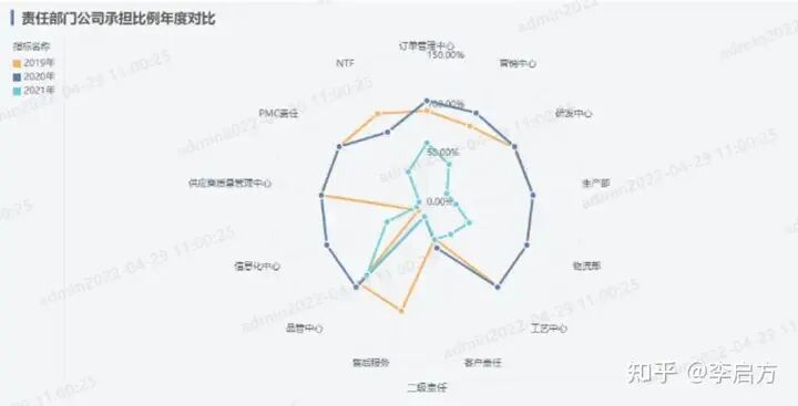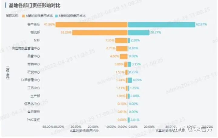 基地各部门责任影响对比发现:B基地在物流管理、责任界定(NTF:无法划分责任)、供应商质量管理方面明显优于A基地。整体说明了 B基地的管理水平高于A基地。下钻对比,发现B基地在2020年及以后改进了物流、供应商管理,但订单管理中心与PMC的责任却突出,与业务部门沟通后得知,2020年架构有调整,B基地的订单统一由A基地的订单和PMC部门管控,远程沟通的不便可能导致问题订单量上升。