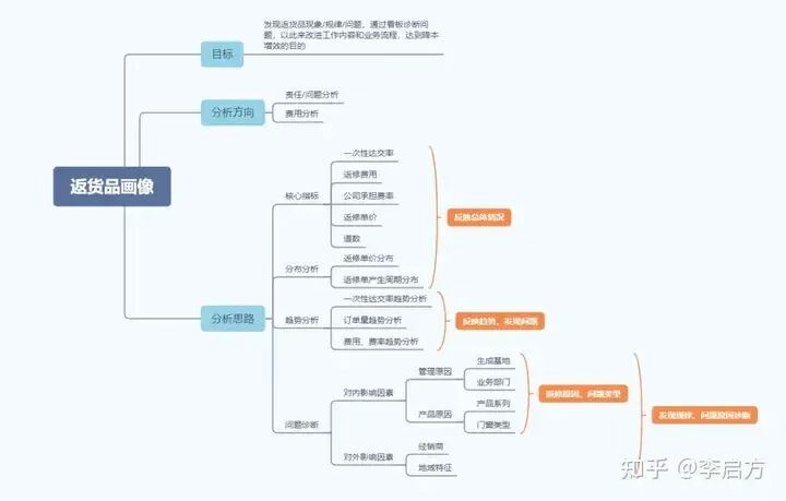 返货品画像的分析思路从核心指标、分布分析、趋势分析、问题诊断这四个部分展开,更多细节思路如下图所示: