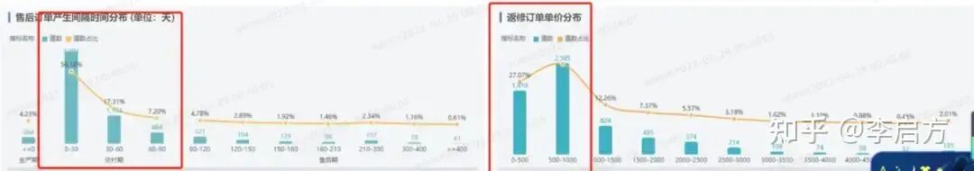 查看返修单价分布,65%的返修单费用在1000元以下,1000元以上返修订单属于高价赔付范围。结合以上趋势分析,我们发现2021年与2019-2020年相比,1000元以下返修订单比例增加接近10%。即返修订单的费用在整体下降。推测原因可能为工艺改进,原先需要整单替换/返修的情况减少。