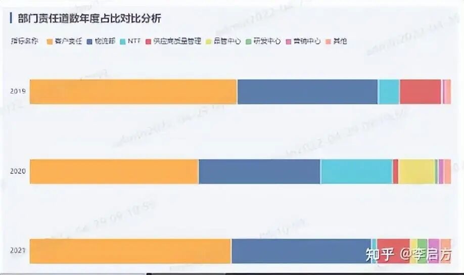 责任部门公司承担比例年度对比发现:公司费用下降主要来自客户责任、NTF、物流的费用下降。因物流可分为公司合作物流、经销商指定物流、经销商合作物流等类型,不同类型赔付标准不同,说明公司对物流公司的管理越来越标准化,返修整体责任划分更清晰。生产一科的生产质量明显低于其他生产科,需要特别关注。