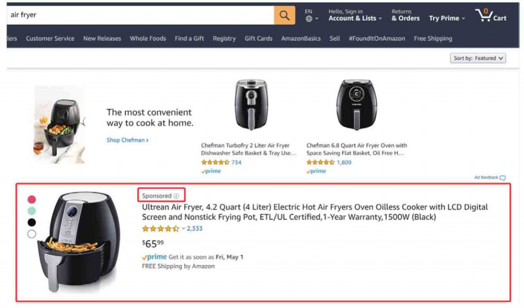亚马逊目前主要提供的是平台内部的广告服务。如下图所示,它展示了亚马逊产品搜索结果的页面,其中用红框标出的部分代表了一个搜索结果。在该结果的小红框内,我们可以看到一个”Sponsored”的标签,这表明它是一个站内广告。如果你的产品参与了站内广告推广,它就有机会在此类搜索结果中展示。