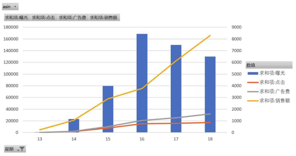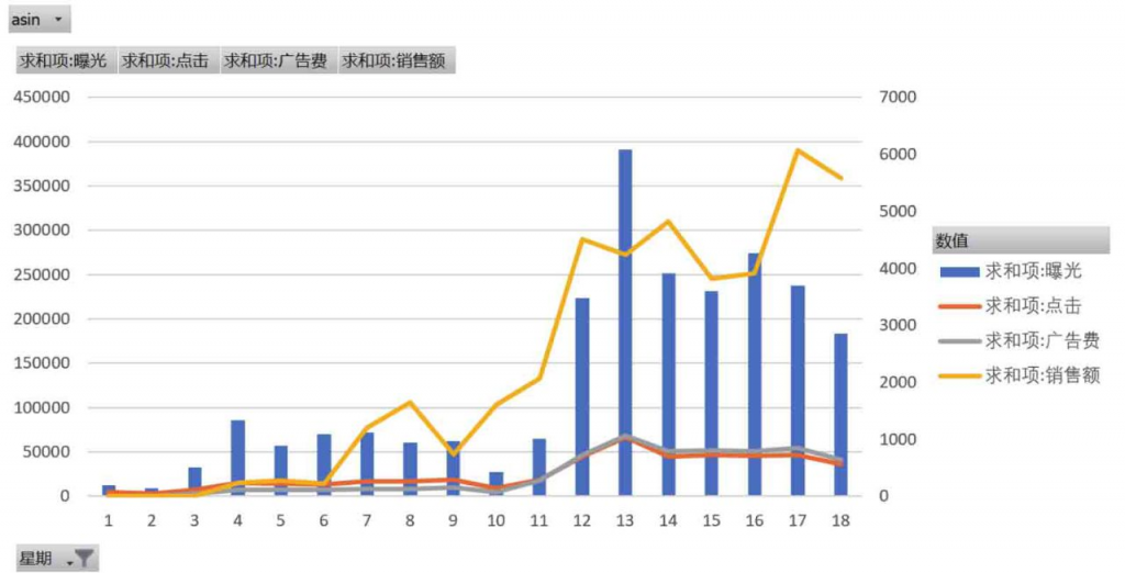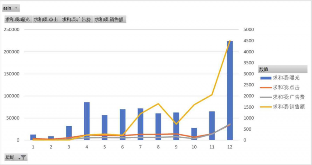 上图展示了该款产品在第1周至第12周的销售数据。从图中可以明显看出,从第11周起,曝光量有了显著的提升,到第12周时,曝光量已是第11周的三倍。与此同时,点击量、广告支出和销售额也呈现出相应的增长趋势。