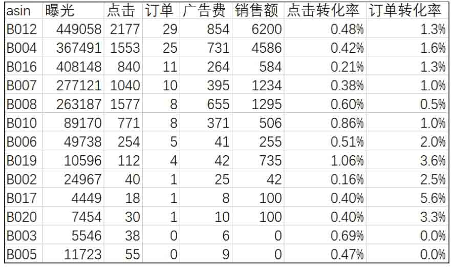 鉴于产品的销售量并不庞大,我们将订单数量超过1的产品归类为优质产品,订单数量为1的产品视为一般产品,而订单数量为0的产品则被认为需要进一步改进。根据我们的计算,平均订单转化率为1.1%,而平均点击转化率为0.42%。通过这样的分类方法,我们可以更精准地定位哪些产品值得广告投入,从而优化广告资源的分配。