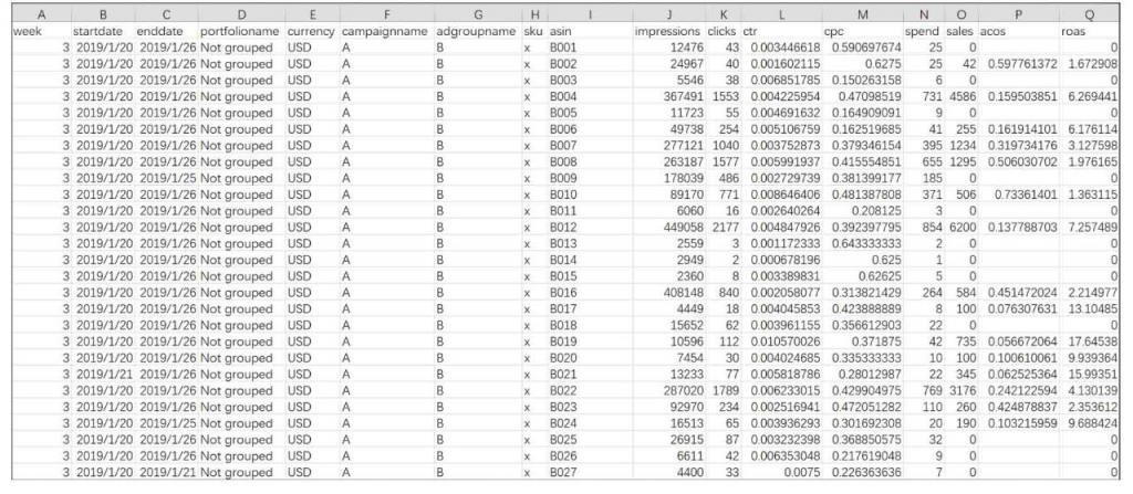 从亚马逊导出的原始数据报表(如上表所示)存在一些问题,包括表头的混乱以及数据的缺失。为了提高数据的可读性和实用性,我们对原始数据进行了一系列的修改和补充。具体来说,我们对列名进行了重新命名,增加了包括“week”(周期)、“campaign name”(广告活动名称)、“ad group name”(广告组名称)、“sku”(库存单位)、“asin”(亚马逊标准识别码)、“ctr”(点击转化率)等列名。