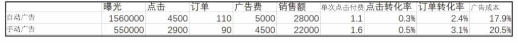 观察点击转化率和订单转化率,手动广告的表现优于自动广告;
