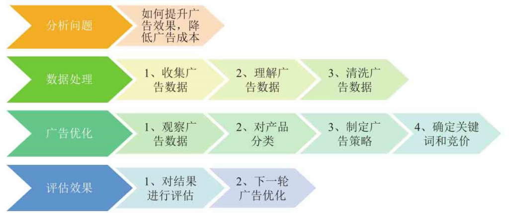 (3)广告优化:基于对广告数据的理解,观察广告表现,对产品进行分类,制定广告策略,确定关键词和竞价。