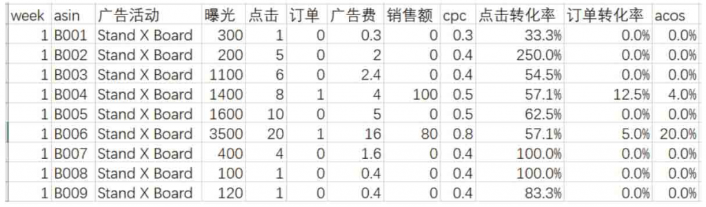 通过整理,我们能够提取出所需的列名和数据。在这一过程中,我们对数据进行了筛选,选择了包括“week”(周期)、“asin”(产品编码)、广告活动名称、曝光次数、点击次数、订单数量、广告费用、销售额、CPC(每次点击成本)、点击转化率、订单转化率、ACoS(广告成本销售比)等关键指标,并将部分英文列名翻译成中文,以便理解和分析。然后,我们进一步筛选出了与Stand X Board系列相关的产品数据,最终得到的结果如下表所示。