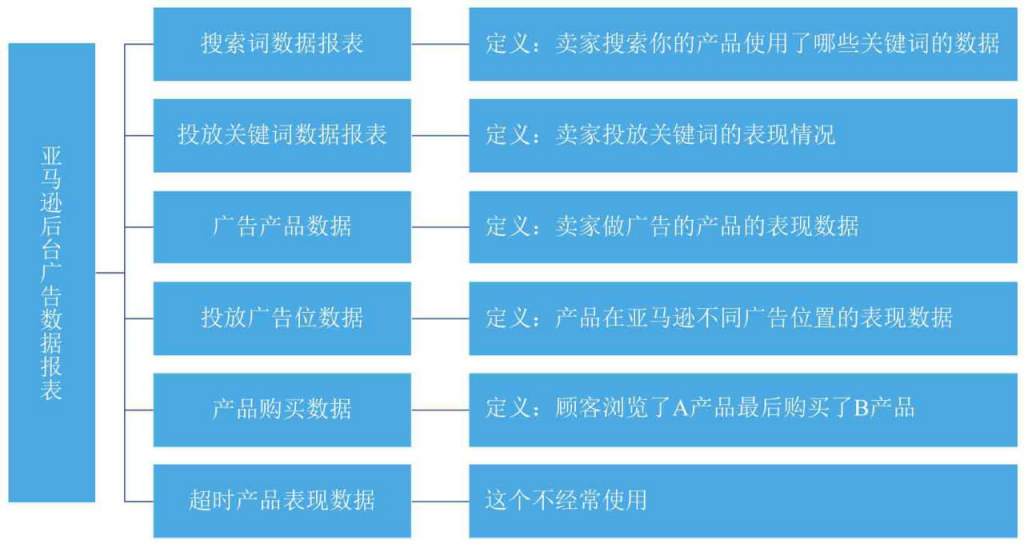 亚马逊提供了六种不同的广告数据报表,用于后台分析,如图中所示。