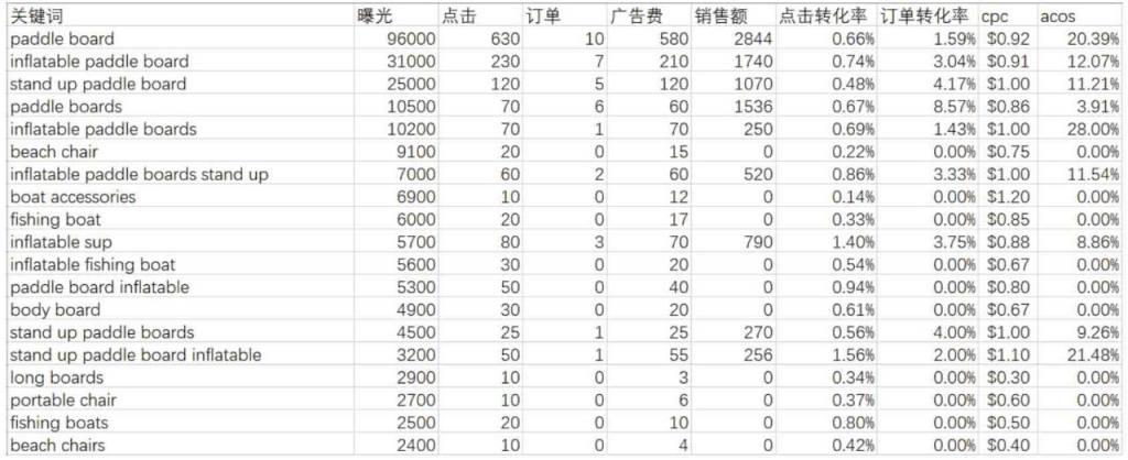 在之前的数据处理过程中,我们主要侧重于数据层面的整理和清洗,并建立了评估指标,但并没有充分考虑与业务相关联的实际需求。在分析搜索词数据时,我们发现有些搜索词,例如”body board”,与该产品关联度不高,因为”body board”并非冲浪板的关键词。使用这类关键词进行广告投放,无法吸引目标流量,并且可能会降低广告的整体转化率。因此,我们决定将这些不相关的关键词排除在外。