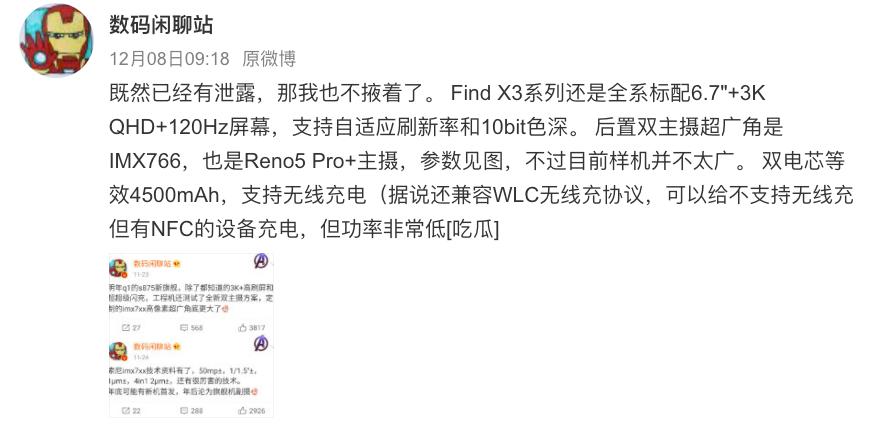 【旗舰】OPPOFindX3曝光 屏幕赞 | 小米11获认证 55W快充