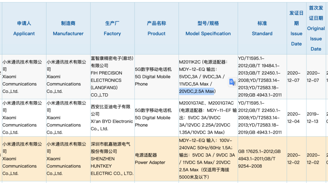 证后台,型号M2011K2C,配备型号为MDY-12-EQ 最大55W充电器。