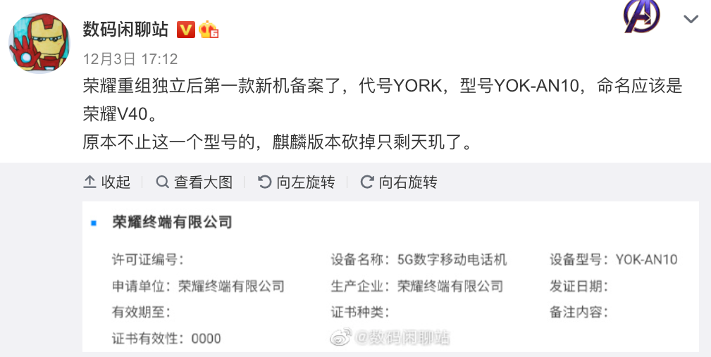 如上图所见,爆料达人分享的信息显示荣耀重组独立后的首款新机代号YORK、型号为YOK-AN10,命名不出意外的话应该是荣耀V40,申请备案的单位和生产企业均为全新的「荣耀终端有限公司」。