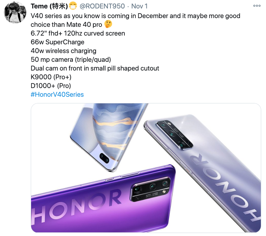 配置上,爆料称原本荣耀V40系列有多个型号,但荣耀重组独立后搭载麒麟处理器的版本被砍掉就只剩下天玑处理器的版本了。事实上,麒麟9000系列目前的情况确实是用一片少一片,华为的Mate 40 Pro系列目前也是很难买的状态,所以荣耀V40不上麒麟9000也能理解。