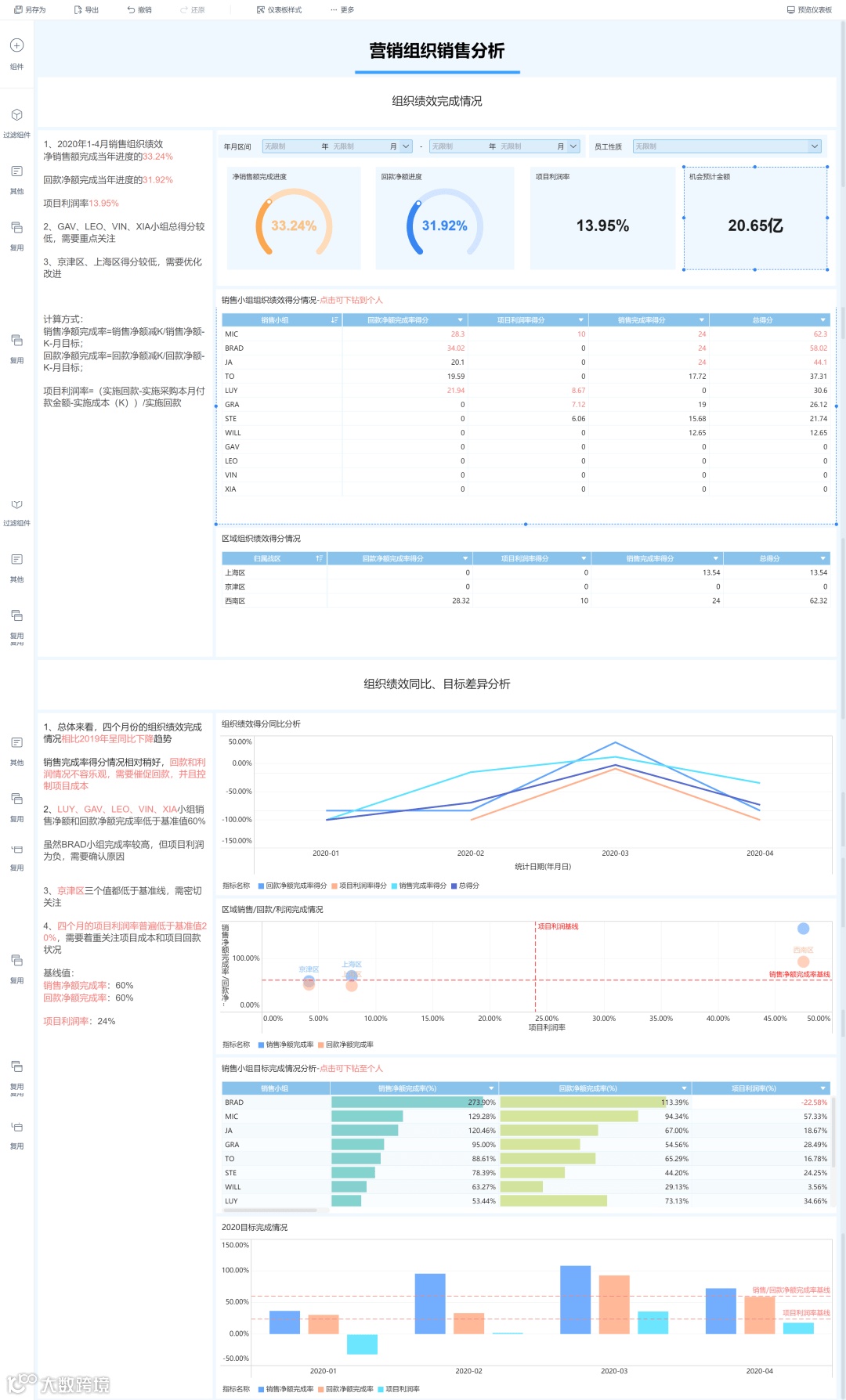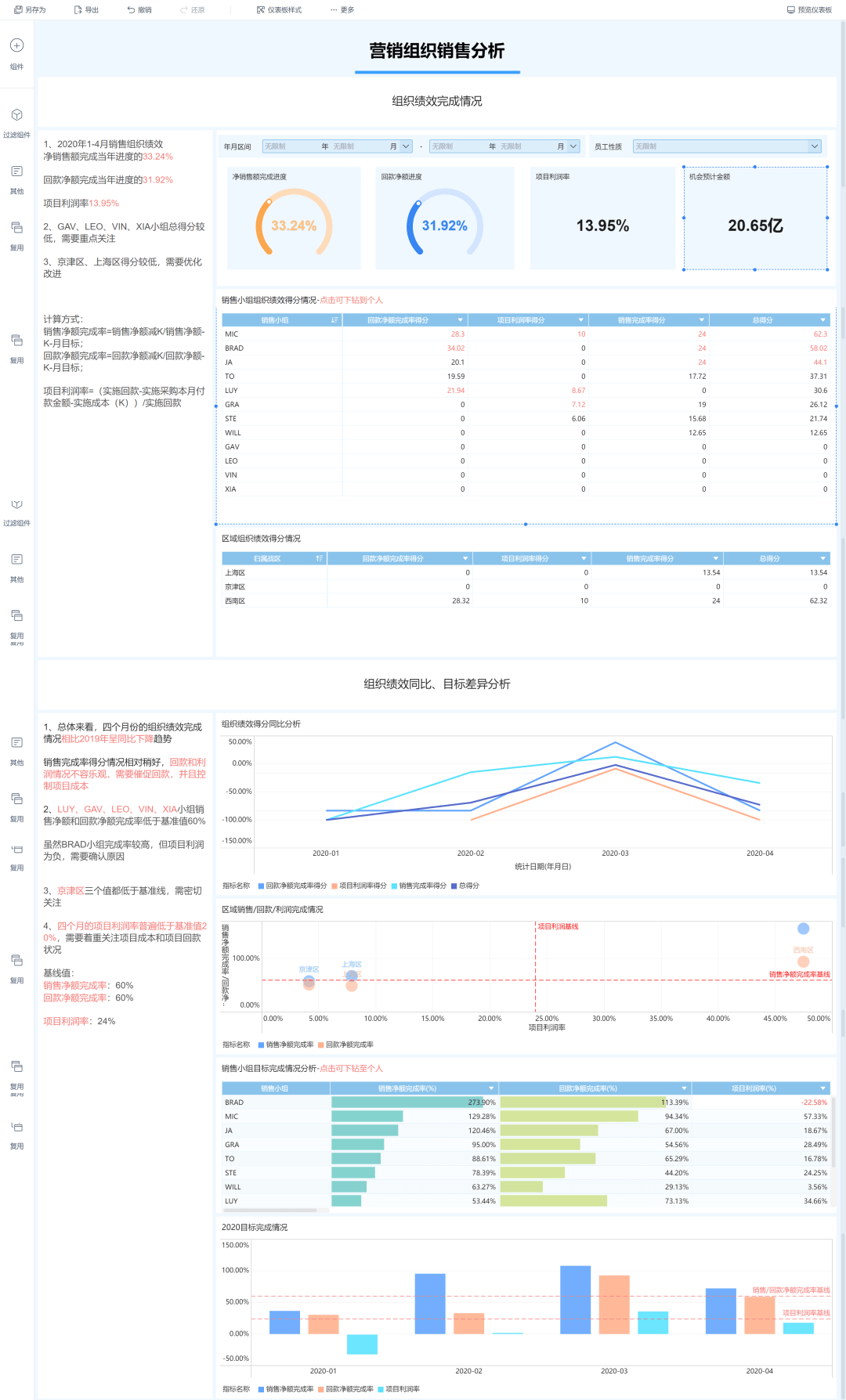 有了清晰的数据呈现,小帆便给出了结论。例如对于“检查销售人员的目标完成进度,并给建议”这一目标,他从两个角度进行描述: