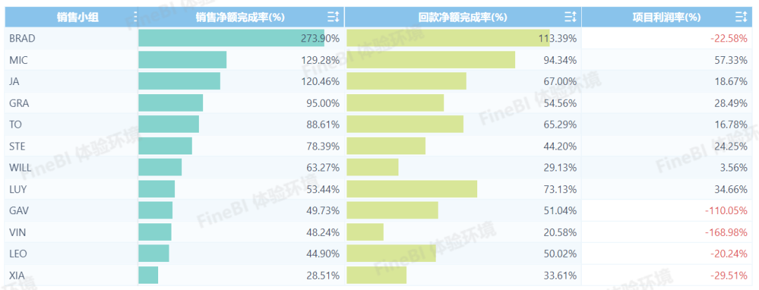 2、LUY、GAV、LEO、VIN、XIA小组销售净额和回款净额完成率低于基准值60%;虽然BRAD小组完成率较高,单项目利润为负,需要确认原因;